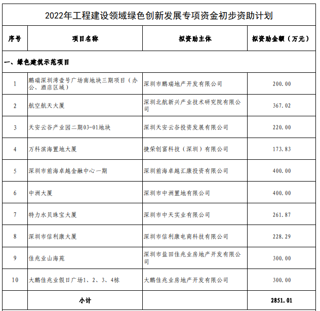深圳市住房和建設(shè)局關(guān)于2022年工程建設(shè)領(lǐng)域綠色創(chuàng)新發(fā)展專項資金初步資助計劃的公示